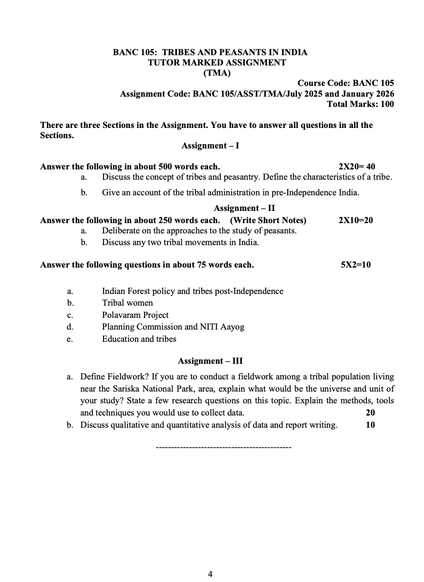 Through BANC-105, students explore themes such as tribal identity, land relations, agrarian structure, social change, and rural development, highlighting the anthropological perspectives on India’s diverse communities. It emphasizes both continuity and change within traditional societies and discusses government policies and welfare programmesaimed at tribal and rural upliftment.
