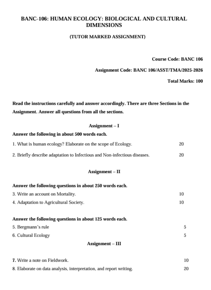 We provide you with the latest, updated, and accurate solved assignments for the session July 2025 – June 2026, specially designed for IGNOU learners. These solved assignments follow the exact syllabus and official guidelinesprescribed by IGNOU for the Bachelor of Science (Anthropology) (BSCFAN) programme.
