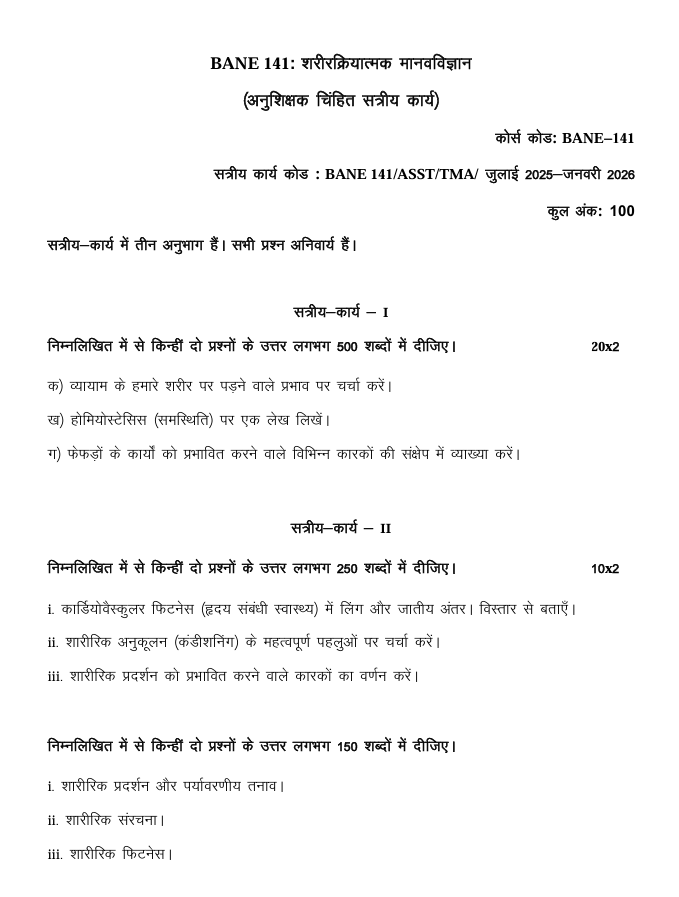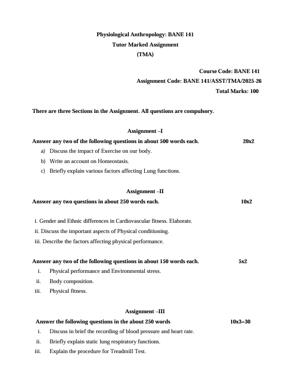 This course emphasizes the biological basis of human physical functioning and its variation across environments and populations. Our solved assignment is prepared with utmost care, strictly according to IGNOU’s official guidelines, prescribed word limits, and the latest question patterns—ensuring maximum marks in your assignment evaluation.