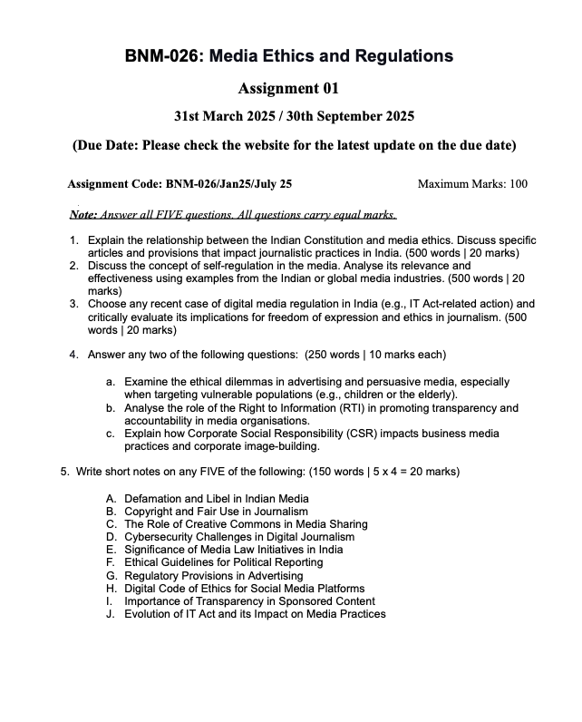 This course focuses on developing an ethical framework for modern journalism, introducing learners to various media laws like the Press Council Act, Right to Information Act, and Copyright Law. Our solved assignment covers all key topics in simple and comprehensive answers, aligned with IGNOU’s evaluation pattern and marking scheme.