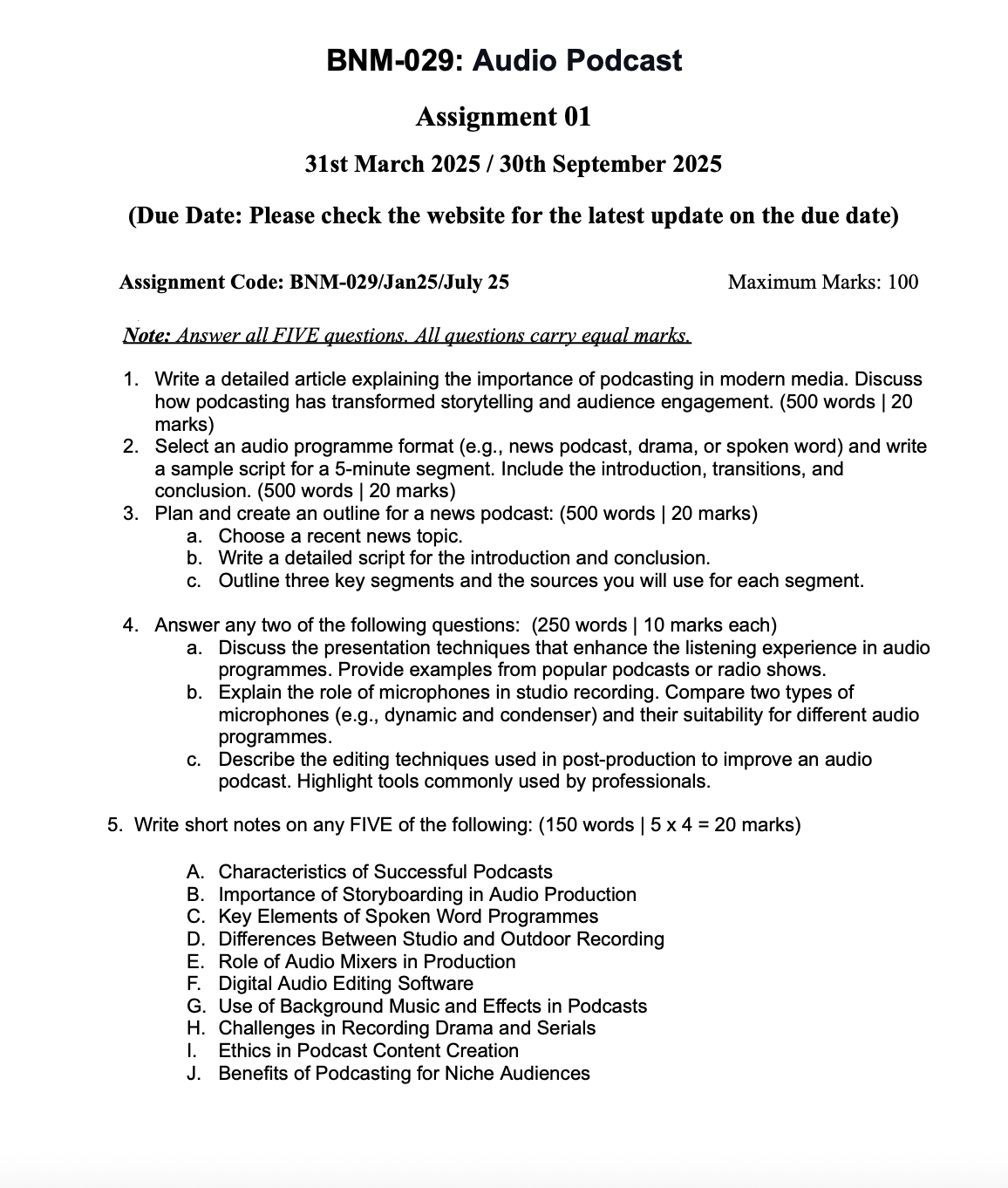 This course focuses on both creative and technical dimensions of podcasting. Learners will understand sound aesthetics, scripting for audio, voice modulation, and post-production editing. Our solved assignment ensures that each answer meets IGNOU’s academic and word-limit requirements, helping students achieve excellent results.
