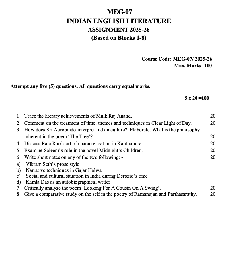 📚 About MEG-007 – Indian English Literature This course is a significant part of IGNOU’s MEG programme, focusing on the rich and diverse body of literature written by Indian authors in the English language. By using our solved assignment, you will not only complete your submission on time but also strengthen your conceptual clarity and exam preparation.