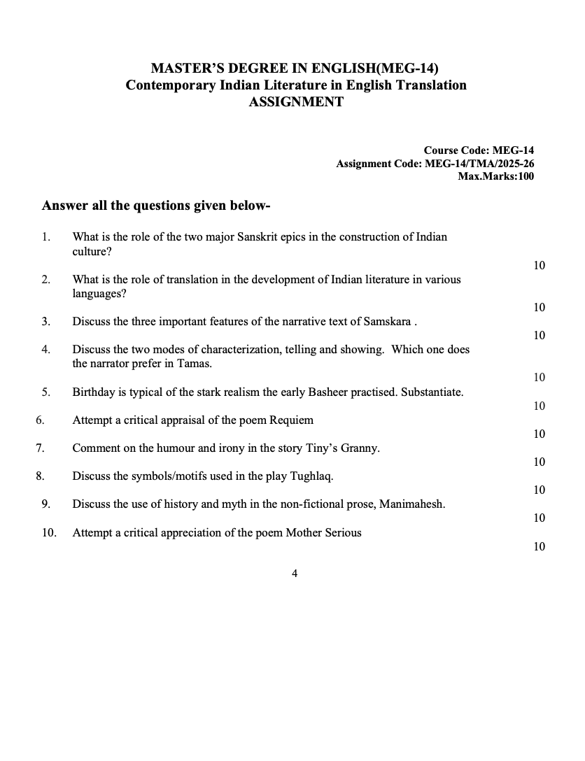 📚 About MEG-014 – Contemporary Indian Literature in English Translation This course is an important part of IGNOU’s MEG programme, exploring a range of contemporary Indian literary works originally written in various regional languages and translated into English. By using our solved assignment, you will not only complete your submission on time but also strengthen your conceptual clarity and exam preparation.